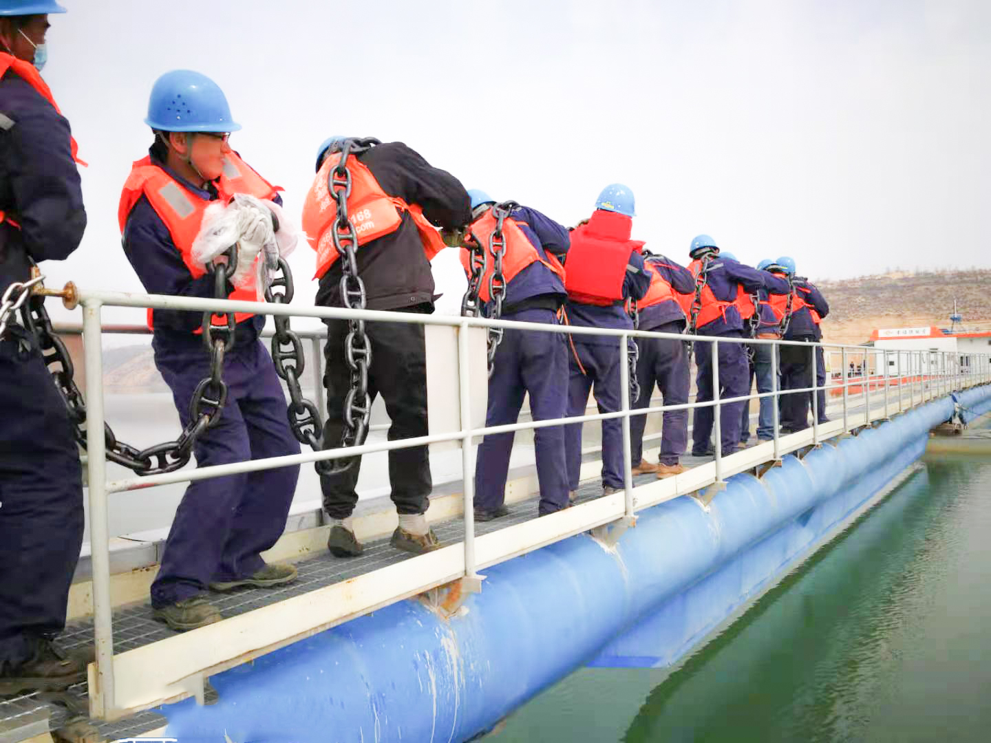 4月6日上午8時(shí),項(xiàng)目部協(xié)調(diào)汽機(jī)班、綜合班抽調(diào)12名檢修人員,負(fù)責(zé)搬運(yùn)和加長(zhǎng)錨鏈工作。工作現(xiàn)場(chǎng),安全專工對(duì)全體工作人員做好安全交底,一再?gòu)?qiáng)調(diào)風(fēng)險(xiǎn)點(diǎn)并檢查預(yù)控措施萬(wàn)無(wú)一失。大家肩扛手搬,接龍作戰(zhàn),小心翼翼地走上廊橋。每個(gè)人肩上的負(fù)重都超過(guò)了50公斤,頭頂是塞北的藍(lán)天白云,腳下是狹窄的廊橋船舷,身上橘色的救生衣與藍(lán)天碧水,形成一道靚麗的風(fēng)景線。當(dāng)日中午12時(shí),錨鏈搬運(yùn)安裝工作順利完成,有力保障了取水泵船和輸水管線的安全運(yùn)行,得到了業(yè)主方的表?yè)P(yáng)和嘉獎(jiǎng)。