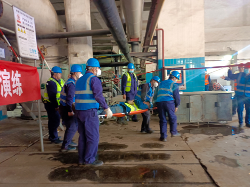 演練模擬一名員工在距離地面0.5米高的水平管道清掃#6機(jī)凝汽器內(nèi)銅管口異物時(shí),因管道濕滑導(dǎo)致腿部摔傷不能移動(dòng)。事故發(fā)生后,現(xiàn)場(chǎng)人員立即組織自救,并及時(shí)向應(yīng)急總指揮報(bào)告。根據(jù)事故現(xiàn)場(chǎng)情況,演練總指揮迅速集結(jié)應(yīng)急救援小組成員,啟動(dòng)有限空間應(yīng)急預(yù)案。搶險(xiǎn)救援組、傷員救護(hù)小組、安全保障小組迅速趕往現(xiàn)場(chǎng),有序開(kāi)展現(xiàn)場(chǎng)救援,待受傷人員脫離危險(xiǎn)后,及時(shí)送往醫(yī)院進(jìn)行治療。