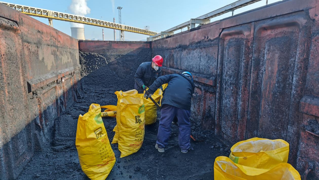 搶卸現(xiàn)場,鐵锨、洋鎬和凍煤的撞擊的“交響樂”此起彼伏,“注意安全!”的提醒聲不絕于耳。零下10多度的室外,寒風(fēng)一陣緊過一陣,隊員互相配合,干得熱火朝天,一刻不停地進(jìn)行著清理工作……大量凍煤從車廂壁、車廂角、車廂底清理下來,一點不漏地落入卸煤溝。短短四天內(nèi),工作人員卸煤3000多袋近120噸,圓滿完成凍煤接卸“攻堅戰(zhàn)”,讓每一粒珍貴的鍋爐“口糧”顆粒歸倉。