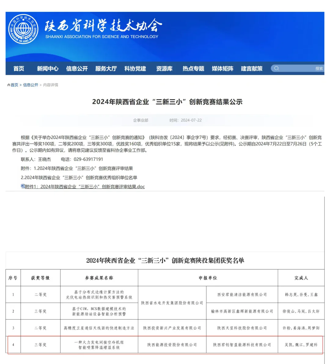 日前,君創(chuàng)科技 “一種火力發(fā)電間接空冷機組智能噴霧降溫增濕系統(tǒng)”榮獲2024年陜西省企業(yè)“三新三小”創(chuàng)新競賽三等獎。
