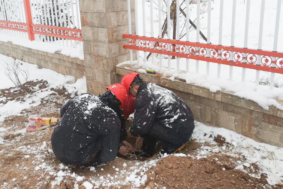 1月9日,趙石畔項(xiàng)目部電氣班工作人員,迎著飄飛的雪花,冒著室外零下十幾度的嚴(yán)寒,輪流用鐵鍬小心挖開凍土,抽絲剝繭,查找電纜故障。最終,經(jīng)過4個(gè)多小時(shí)的不懈努力,順利恢復(fù)了34盞路燈的照明。