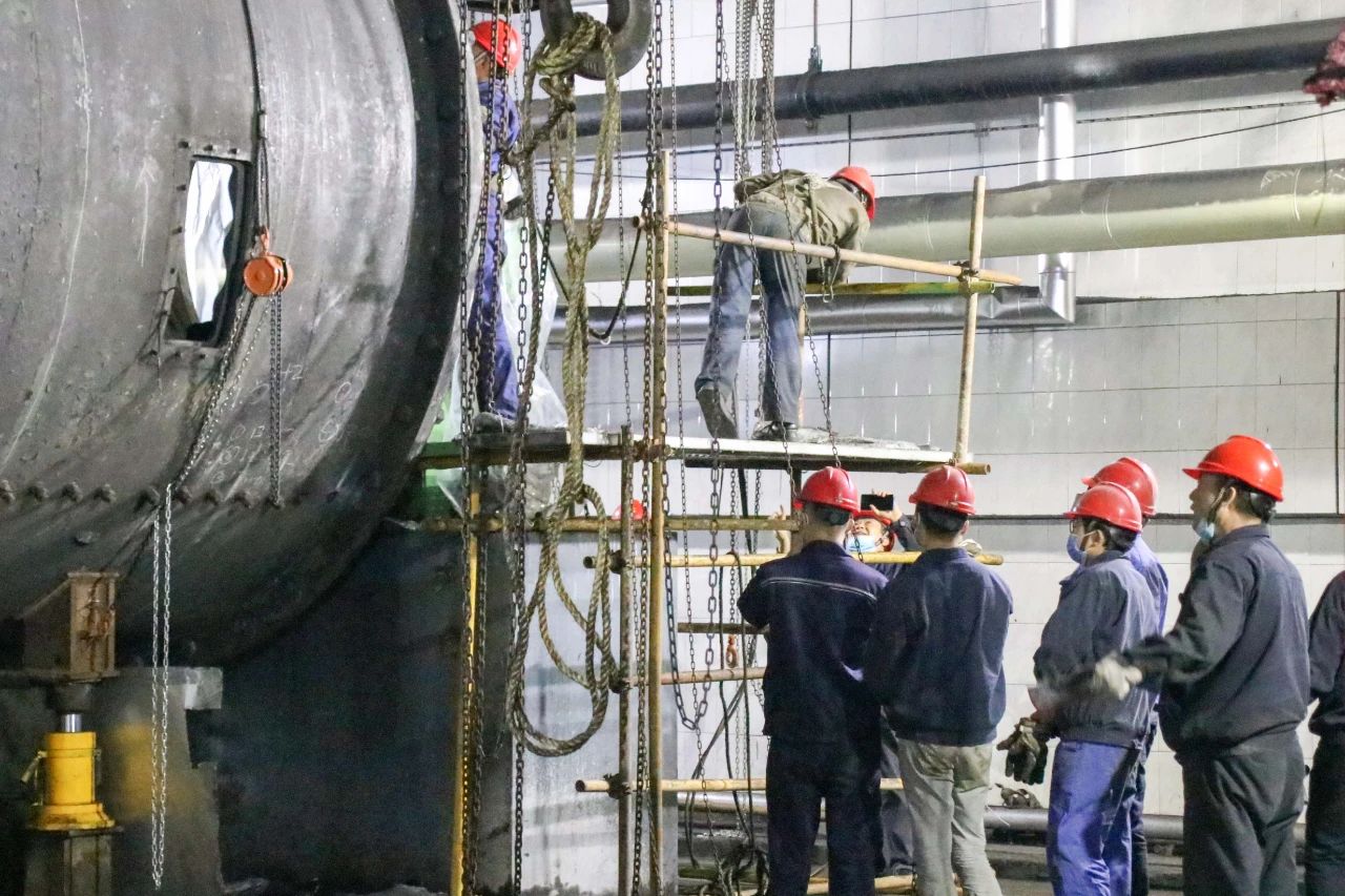 截止目前,經(jīng)過全體人員7個晝夜的奮戰(zhàn),鉗工、焊工、起重工多工種的緊密配合,磨煤機罐體已頂起,端蓋拆除工作正在緊張有序地進行。