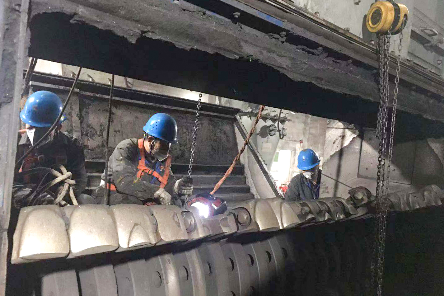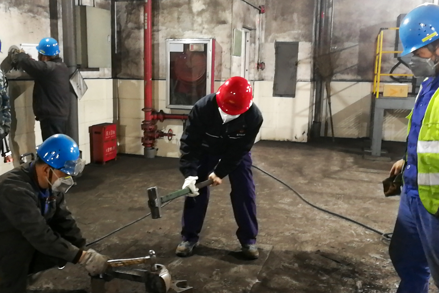 方案一經(jīng)確定,搶修戰(zhàn)役隨即打響。全體參戰(zhàn)人員多路分兵,稱(chēng)重配錘、打磨軸銷(xiāo)、拆除損壞錘臂錘頭,全力投入搶修工作。配對(duì)組在配重過(guò)程中,為了確保一次配重成功,補(bǔ)焊人員精益求精,將誤差控制在0.01kg內(nèi);拆卸組在環(huán)軸與錘臂夾死的處理中,絲毫沒(méi)有因?yàn)椴鹦独щy而有一絲松懈,大家集思廣益,商討制作各種工器具、反復(fù)嘗試各種拆卸方法。最終,在連續(xù)奮戰(zhàn)48小時(shí)后,搶修任務(wù)順利完成,試轉(zhuǎn)一次成功??粗皾M血復(fù)活”的設(shè)備重新投入使用,全體參戰(zhàn)人員的臉上露出了會(huì)心的微笑。